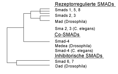 Der Name der Smad-Proteine leitet sich von den sie kodierenden Genen ab, die in genetischen Studien an Drosophila und C. elegans erstmals identifiziert wurden. Das Drosophila-Gen wird als Mad (Mother against decapentaplegic), das Gen in C. elegans als Sma (Small body size) bezeichnet. Die Kombination dieser beiden Bezeichnungen kreiert den Namen „Smad“. Strukturell und funktionell unterscheidet man drei Unterfamilien der Smad-Proteine (Abbildung 1), denen allen eine ähnliche, stark konservierte Grundsequenz zu eigen ist.