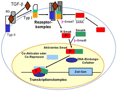 Sämtliche Effekte werden über membranständige Glycoproteinrezeptoren (Typ 1 und 2) vermittelt, die beide über Serin/Threonin-Kinase-Aktivität verfügen und spezifisch für die verschiedenen Mitglieder der TGF-β-Familie sind. Es kommt nur zu einer Auslösung von Folgeprozessen, wenn beide Rezeptoren sich durch die Überbrückung mit TGF-β zu einem Komplex zusammenlagern. Hierbei bindet TGF-β zunächst an den Typ-2-Rezeptor und ermöglicht damit die Annäherung des Typ-1-Rezeptors. Erst nach der Zusammenlagerung der Rezeptoren wird die Kinaseaktivität des Typ-1-Rezeptors „angeschaltet“, und sogenannte Smad-Proteine können sich daran anlagern, um durch ihn phosphoryliert zu werden. Sie sind es, die TGF-β-vermittelte Signale letztlich bis in den Zellkern an ihr Ziel, die „TGF-β-Gene“, übertragen (Abbildung 2, Seite16).