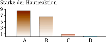 Durch Auswahl der geeigneten Testkonzentration, die im allgemeinen höher im Vergleich zur normalen Anwendung gewählt wird, werden auf diese Weise leichte Hautirritationen erzeugt. Der Grad der Reaktionen als Maß für die Hautverträglichkeit wird im Vergleich der Testsubstanzen untereinander bewertet. Die unter diesen Testbedingungen induzierten Hautreaktionen von Persil Sensitiv im Vergleich zu herkömmlichen Produkten wurden graphisch dargestellt (Abbildung 2). Bei wiederholtem Kontakt mit Waschlaugen können sich die leichten, für das Auge meist nicht sofort sichtbaren Irritationen addieren und nach einiger Zeit zu einer Hauschädigung führen.